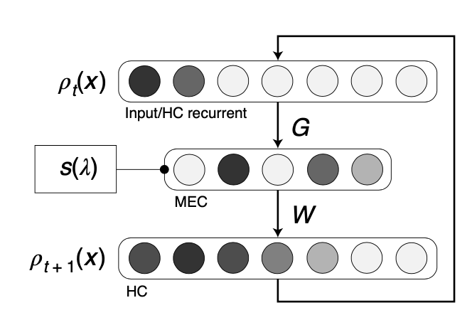 Considering the biological meaning of this genrator-based solution, sequence generation can be interpreted as a linear feedback loop of the EHC: current state profile is transformed to MEC via equating spectral components \(\phi_k\) (columns of \(G\)), rescaled by power spectrum \(s_{\tau}(\lambda)\), and readout to the hippocampal layer by \(W\).