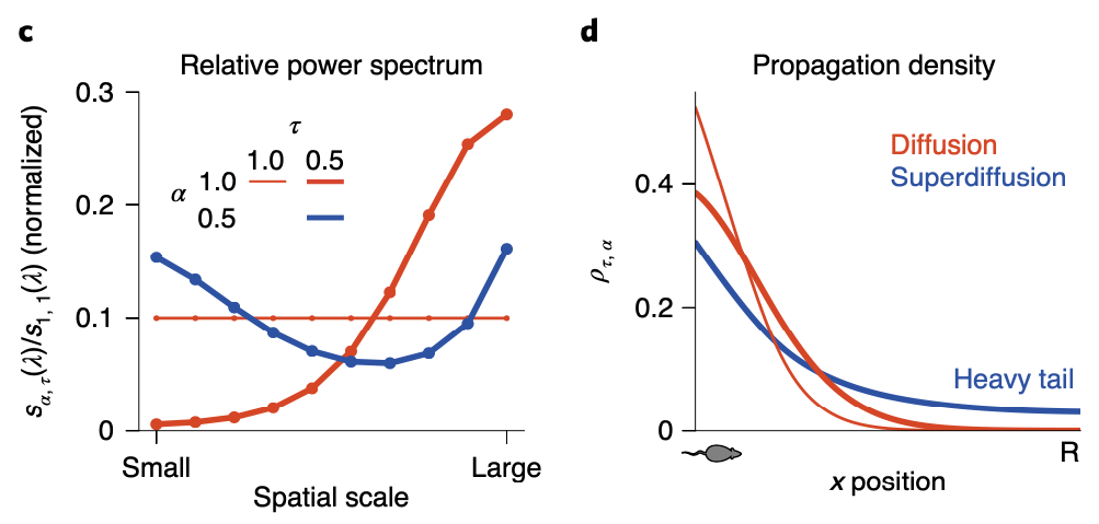 So since now we’ve got a more general version of the analytic solution of the state sequence generation, some of you might want to ask what exactly the role of \(\alpha\) is. As we can see in the above figure, although \(\alpha\) plays its role in balancing global and local search, how it influences balance between two scale search pattern is different with \(\tau\): by setting \(\alpha < 1\), both small and large scale spectral components are upweighted while the intermediate scale is suppressed. This non-monotonous power spectrum allows the agent to search in a large scale aspect, while keeping it’s attention in small scale searching as well. As a result, the propagation density when \(\alpha < 1\) follows a heavy tail distribution, also known as ‘superdiffusion’, allowing the propagator to have more ability to propagate to states distant from the current state.