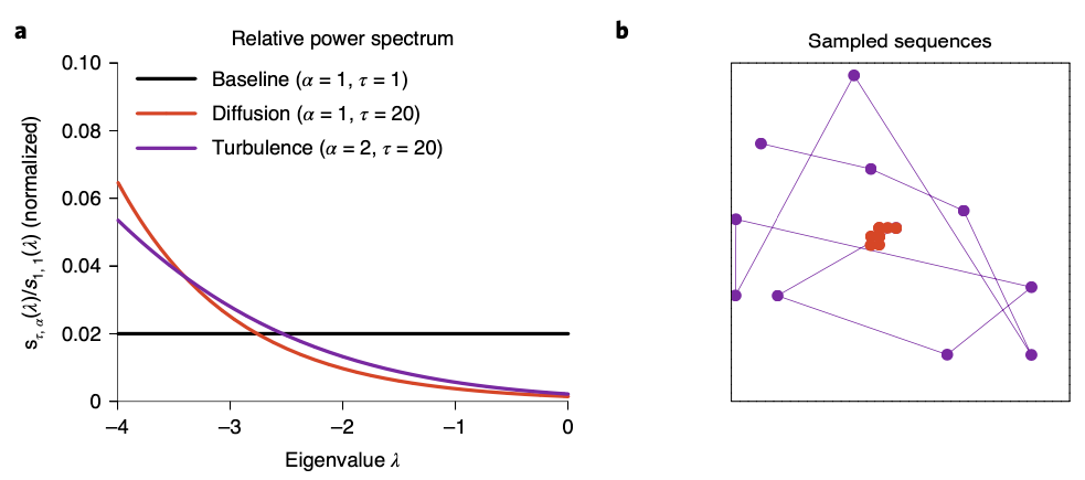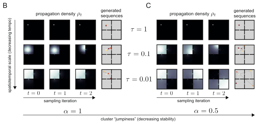 Remind that we have only discussed the sequence generation reigme in case of \(\alpha \leq 1\). What happens when \(\alpha > 1\)? This is the case where we call the turbulent regime. In this case, the trajectory generated sample states in a random manner, thus being inconsistent with the spatiotemporal structure of the environment. (Bottom figure right, purple lines)
