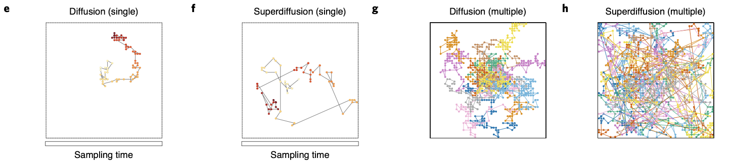 By comparing diffusivive sequence geneartion with superdiffusive case, we can easily see difference in spatial exploration efficiency: while supperdiffusive trajectories visit positions in an approximately homogeneous distribution across all areas, diffusive trajectories faiiled to fully explore all areas.
