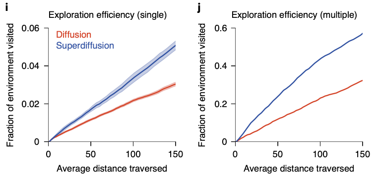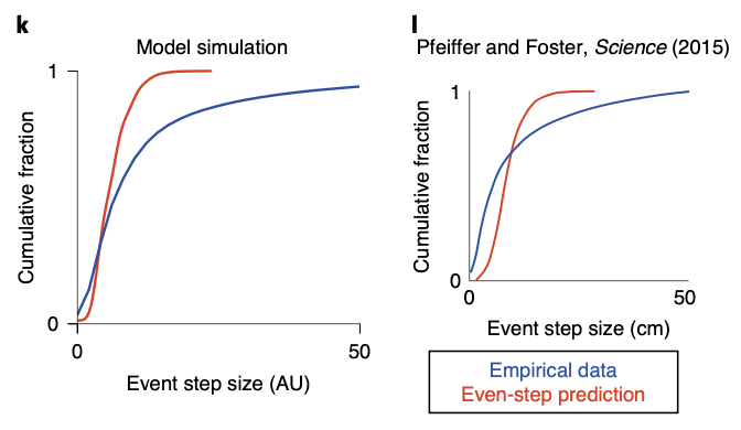 Interestingly, superdiffusion is not only superior to diffusion, but also more biologically plausible. B.E. Pfeiffer and D.J. Foster, 2015 have found that the cumulative fraction histogram of hippocampal sequence generation does not follow the expectation when assuming evenly spaced steps. This meant hippocampal sequence generation occurs in a spatially discontiguous form. As we can see in the figure below, this long-tail histogram can be reproduced in superdiffusive case, implying it’s biological plausibility.