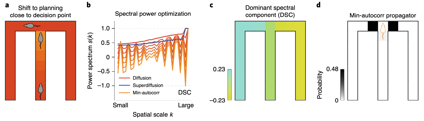 Based on our hypothesis, we can assume that the rodent would shift it’s planning based on minimally autocorrelated power spectrum near the decision point. If we compare the power spectrum between diffusion, superdiffusion and minimally autocorrelated propagator, the minimally autocorrelated case exhibit a significantly dissimilar profile.