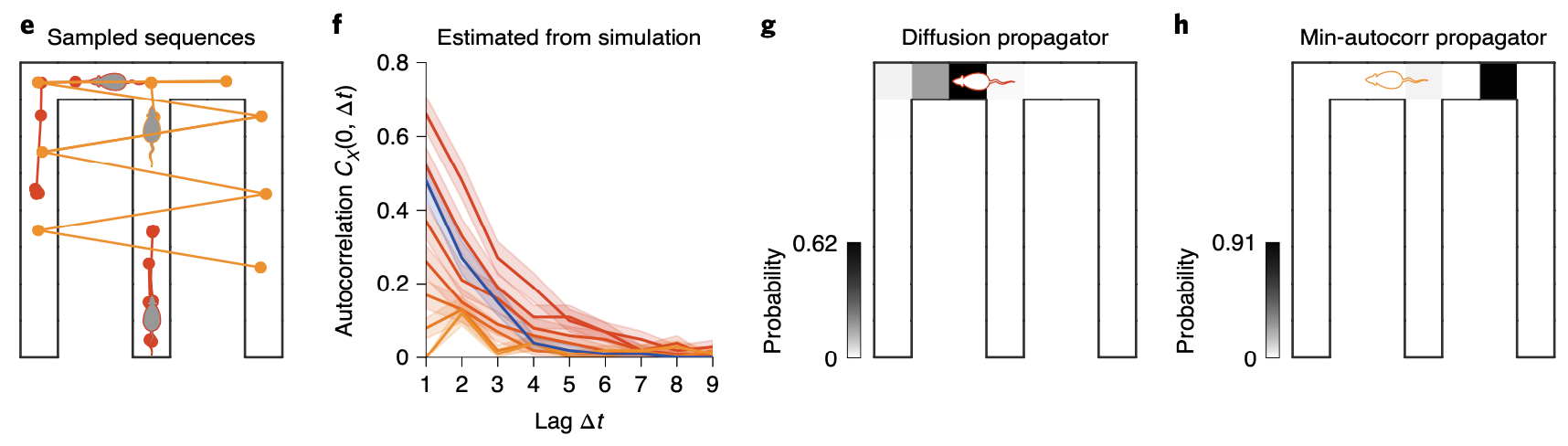 So when would it be useful to generate sequences using a propagator with minimally autocorrelated power spectrum \(s_{\text{mac}}\)? Since sequences generated using it would be highly decorrelated from each other, it has advantage in covering points where states can diverge according to the decision the agent makes. This hypothesis can be tested in a spatial alternation task where a rodent is required to make a binary decision at a junction, leading to a reward or nothing.